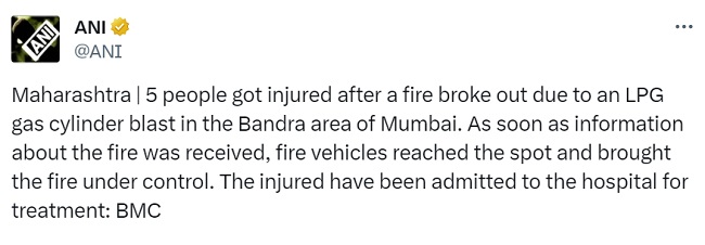 बीएमसी के अनुसार, बांद्रा इलाके में आग लगने की जानकारी मिलते ही दमकल की गाड़ियां मौके पर पहुंची और उन्होंने आग पर काबू पाया। बीएमसी ने बताया कि घायलों को इलाज के लिए अस्पताल में भर्ती कराया गया है।